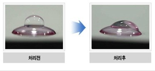 아래 사진에서 보듯이 플라즈마 코팅 된 렌즈 표면은 습윤성이 높아서 (눈)물이 렌즈 표면에서 오랬동안 머무르게 됩니다.